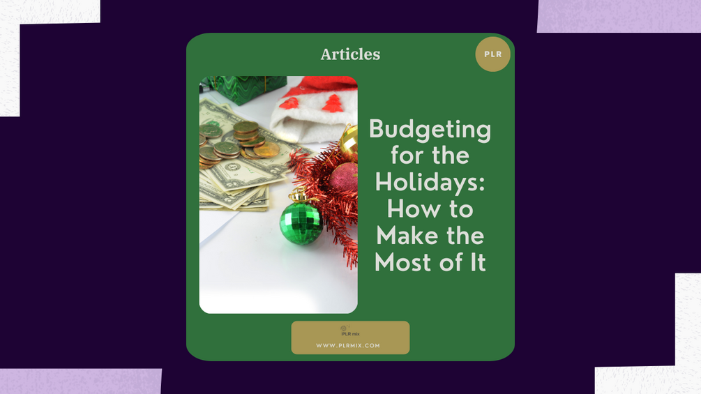 Budgeting for the Holidays How to Make the Most of It. Article€3€3https://schema.org/InStockeurPLRmixPLRmix +700 words Google Docs version PLR rightsThis product is not currently for sale.Add to wishlist New wishlistShareShare on XShare on Facebook Copy linkCopy product URLNo refunds allowed